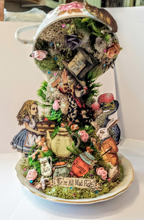 For the head, I used one of the images from one of the collage sheets Alpha Stamps sent me and created a soldered square, then glued a bit of embellishment (I think it was part of an earring maybe?) in one corner. I used a bead for the neck. The wire heart was originally going to be for hanging her on a wall, until I changed direction, but it helps provide stability for the head and neck, so I just decorated it with some of the little plastic flower beads they sent me and added the "Alice's Adventures in Wonderland" graphic from one of the collage sheets.