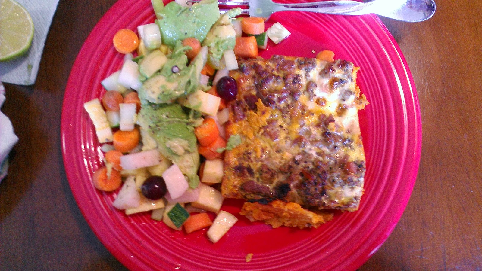 | Breakfast -- breakfast casserole (this week it's two sweet potatoes, shredded, some turkey sausage from extra I made last week, and some diced prosciutto, with sauteed onions and garlic, with 10 eggs, divided into 6 servings), some raw celery and carrots, and an avocado with lime juice and salt. |